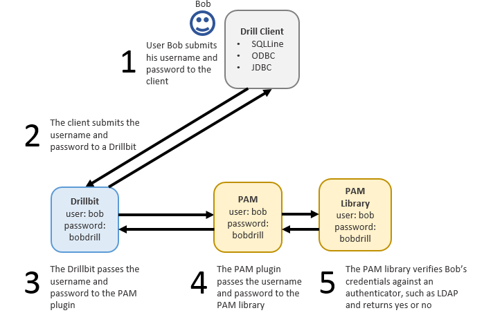 The client passes the username and password to a Drillbit as part of the connection request, which then passes the credentials to PAM. If PAM can verify that the user is authorized to access Drill, the connection is successful, and the user can issues queries against the file system or other storage plugins, such as Hive or HBase. However, if PAM cannot verify that the user is authorized to access Drill, the connection is terminated as AUTH_FAILED.