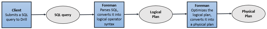 The Drillbit that receives the query from a client or application becomes the Foreman for the query and drives the entire query. A parser in the Foreman parses the SQL, applying custom rules to convert specific SQL operators into a specific logical operator syntax that Drill understands. This collection of logical operators forms a logical plan. The logical plan describes the work required to generate the query results and defines which data sources and operations to apply.