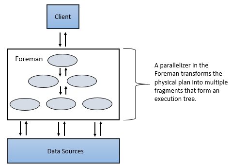 A parallelizer in the Foreman transforms the physical plan into multiple phases, called major and minor fragments. These fragments create a multi-level execution tree that rewrites the query and executes it in parallel against the configured data sources, sending the results back to the client or application.