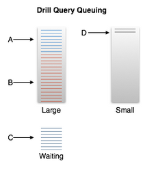 The Drill queuing configuration in this example tends to give many users running small queries a rapid response. Users running a large query might experience some delay until an earlier-received large query returns, freeing space in the large queue to process queries that are waiting.