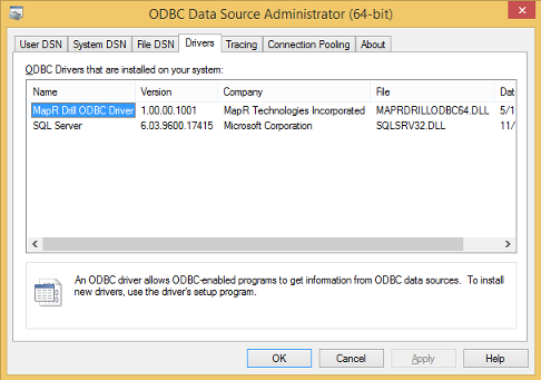 Click the Drivers tab and verify that the MapR Drill ODBC Driver appears in the list of drivers that are installed on the computer.
