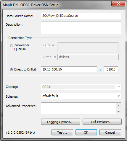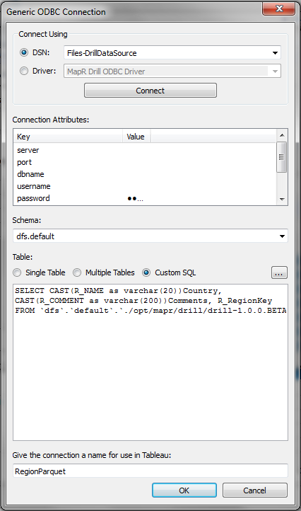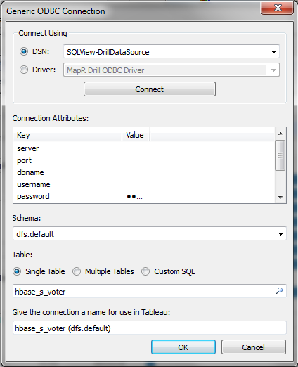 To create a connection without an existing DSN, select the Driver option, select the MapR Drill ODBC Driver from the list and click Connect. Then, configure the connection using the steps in step 1 and click OK.In this example, we created SQLView-DrillDataSource to access the view. - In the Schema field, select the schema that contains the views that you created in Drill Explorer.