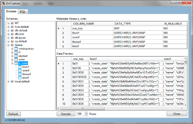 Drill Explorer displays the metadata and column families for the selected HBase table. - To create a view of the HBase table, click the SQL tab.