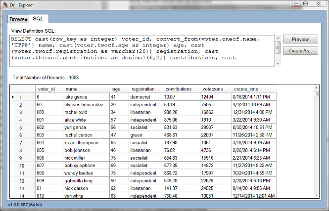 In this example, the following SQL was entered:SELECT cast(row_key as integer) voter_id, convert_from(voter.onecf.name, 'UTF8') name, cast(voter.twocf.age as integer) age, cast(voter.twocf.registration as varchar(20)) registration, cast(voter.threecf.contributions as decimal(6,2)) contributions, cast(voter.threecf.voterzone as integer) voterzone,cast(voter.fourcf.create_date as timestamp) create_time FROM hbase.voterHBase does not contain type information, so you need to cast the data in Drill Explorer. For information about SQL query support, see the SQL Reference.
