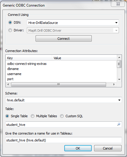 To create a connection without an existing DSN, select the Driver option, select the MapR Drill ODBC driver from the list and click Connect. Then, configure the connection to the Hive table and click OK. - In the Schema field, select the Hive schema.