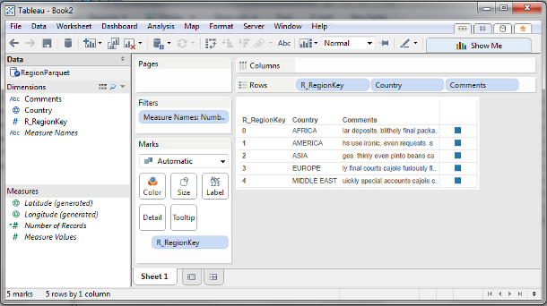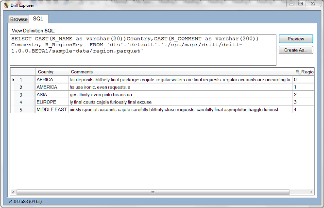 In this example, the following SQL query was entered:SELECT CAST(R_NAME as varchar(20))Country, CAST(R_COMMENT as varchar(200))Comments, R_RegionKey FROM `dfs`.`default`.`./opt/mapr/drill/drill-1.0.0.BETA1/sample-data/region.parquet`Note
