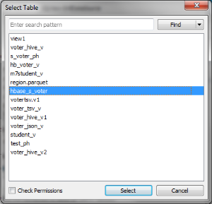 In this example, the Hive schema is named hive.default. - In the Table section, verify that Single Table is selected and then click the Search icon.