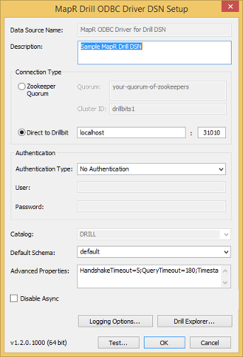 DSN=Sample MapR Drill DSN 64;ConnectionType=Direct;Host=localhost;Port=31010